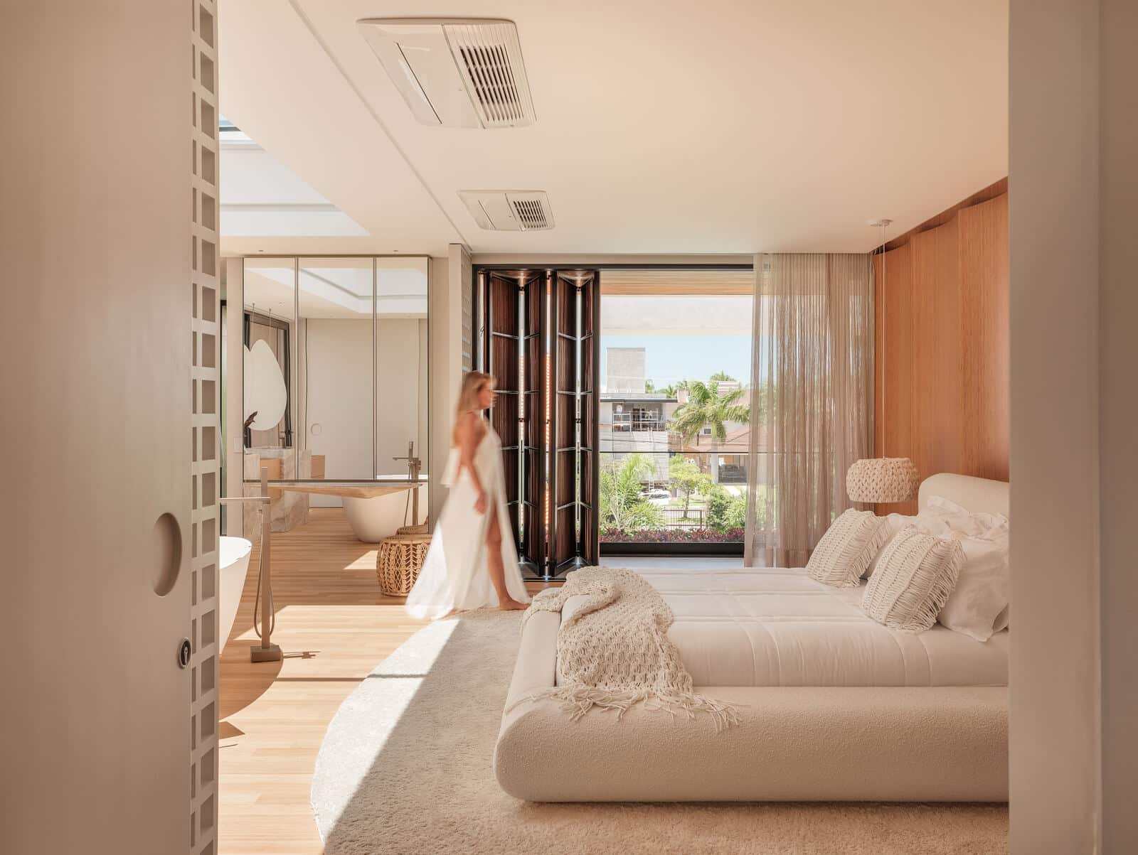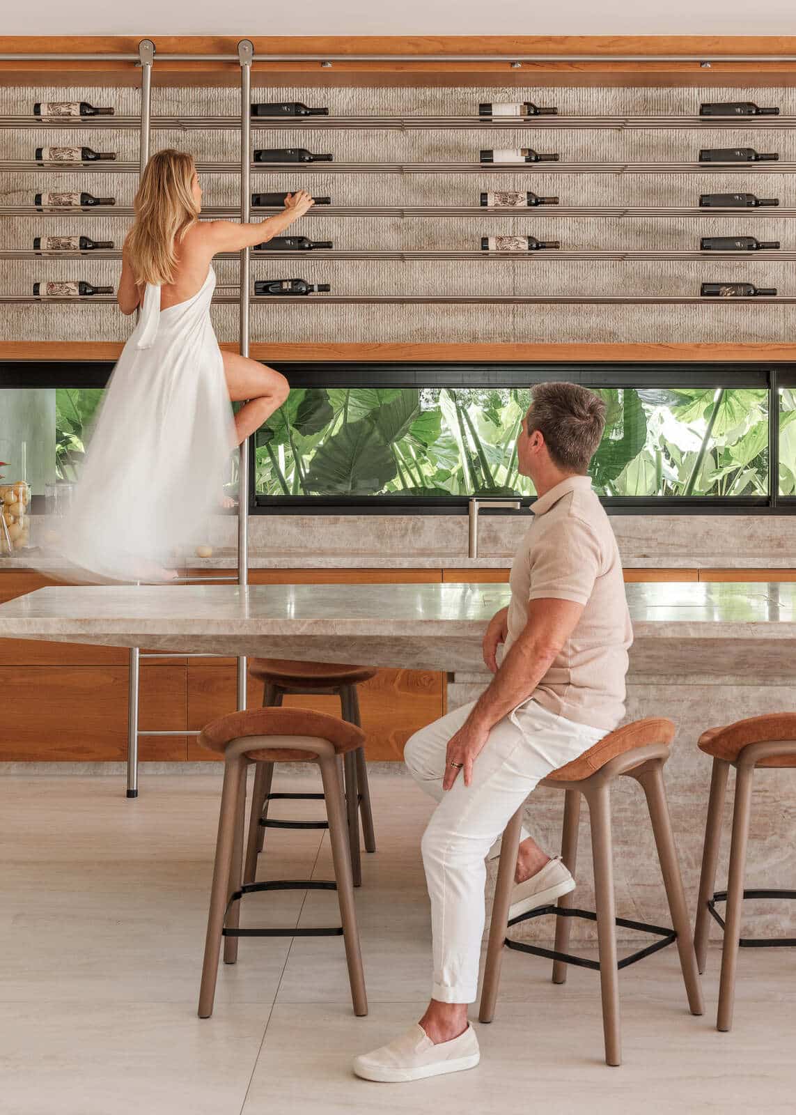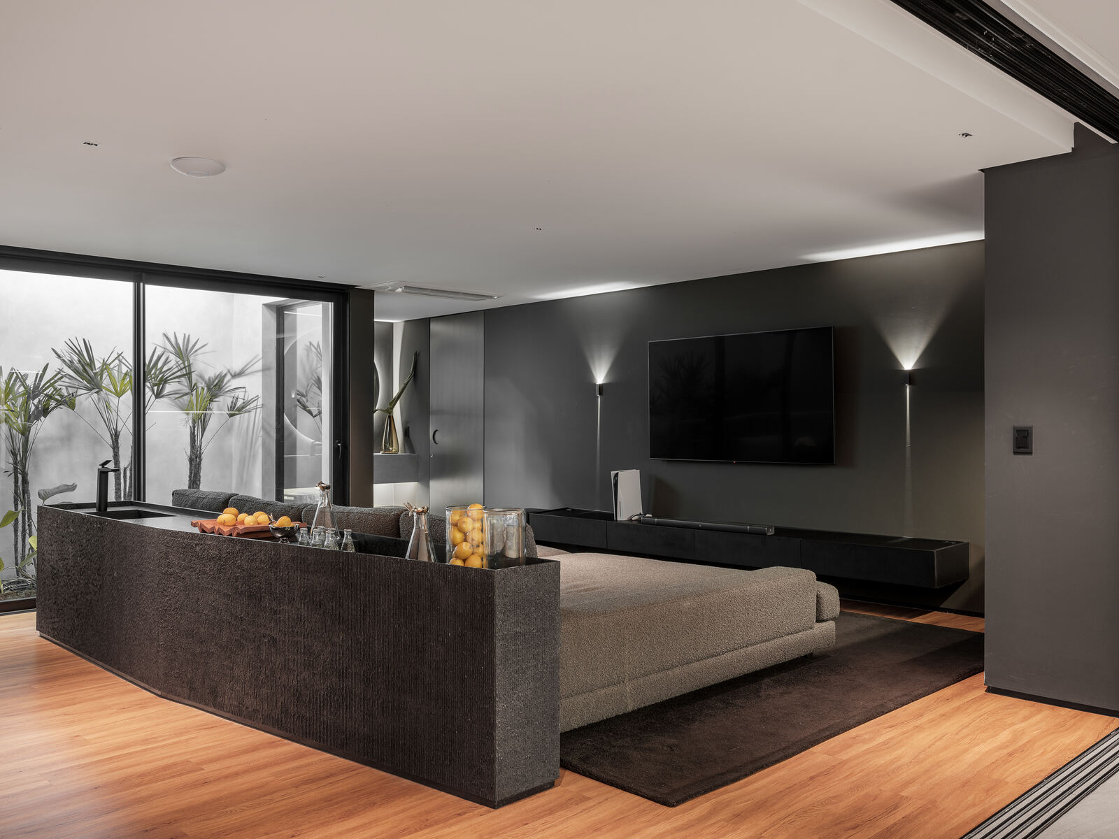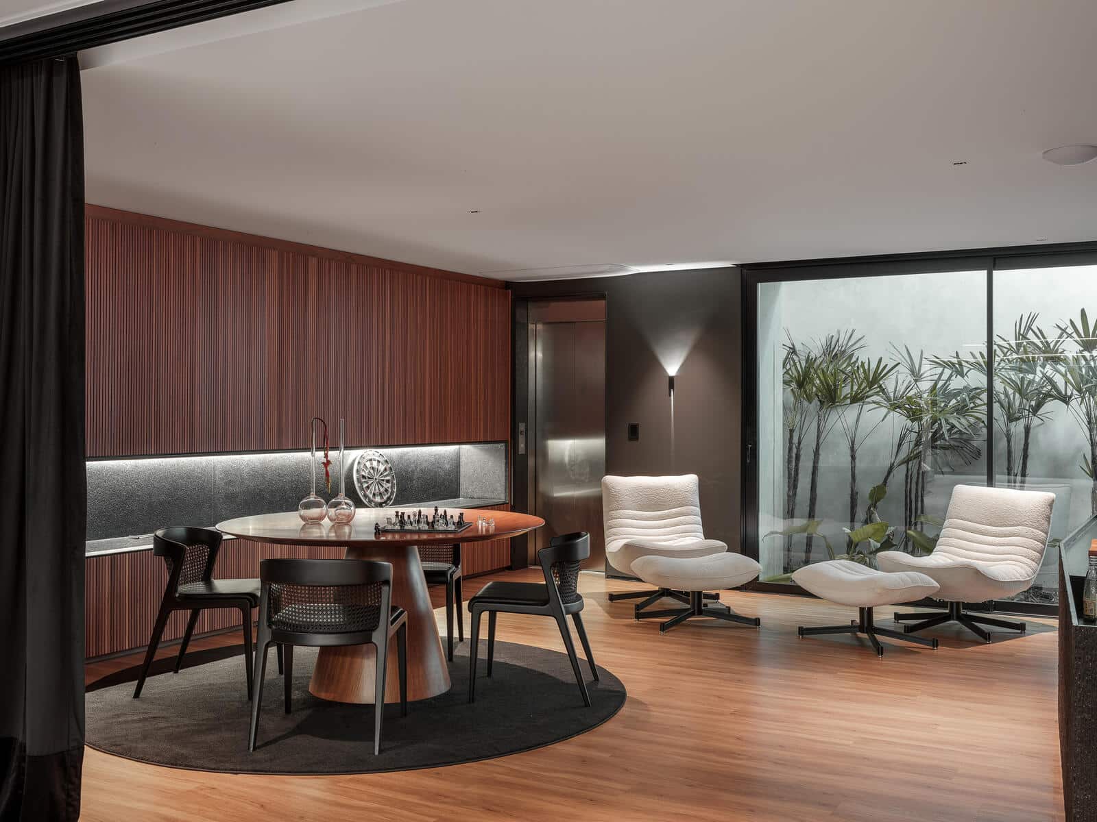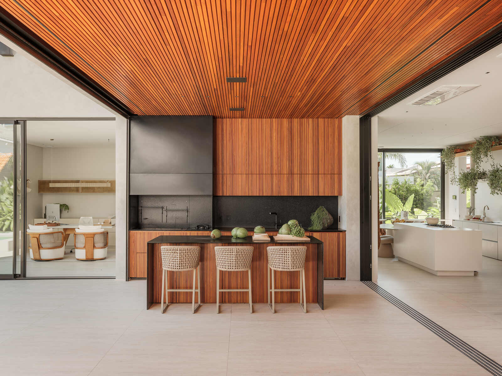 O projeto de interiores da Casa Evergreen é uma fusão harmoniosa entre modernidade e natureza. Com um design aberto e fluido, os ambientes destacam-se pelo uso de linhas limpas e materiais naturais que evocam uma sensação de tranquilidade e elegância.