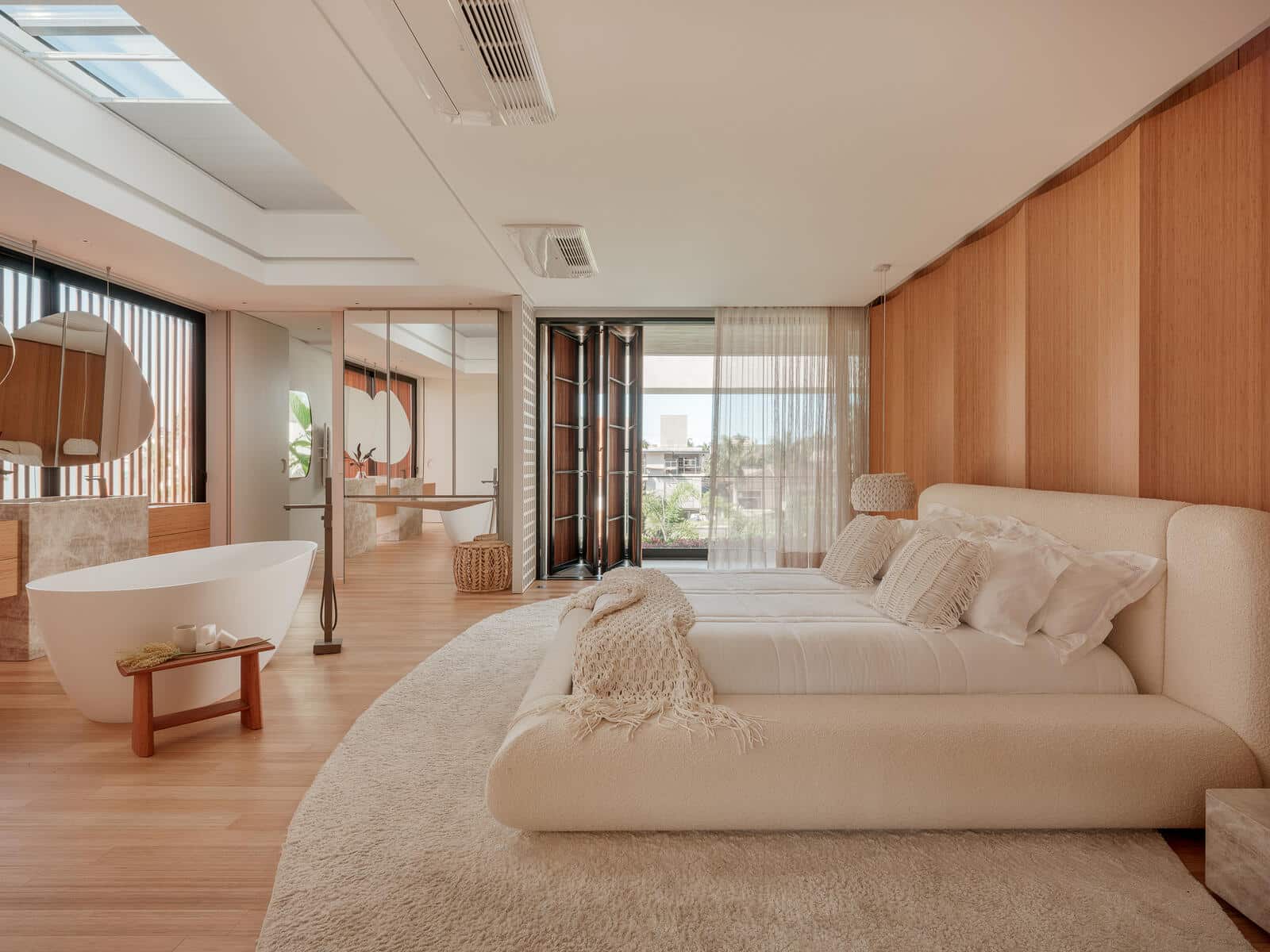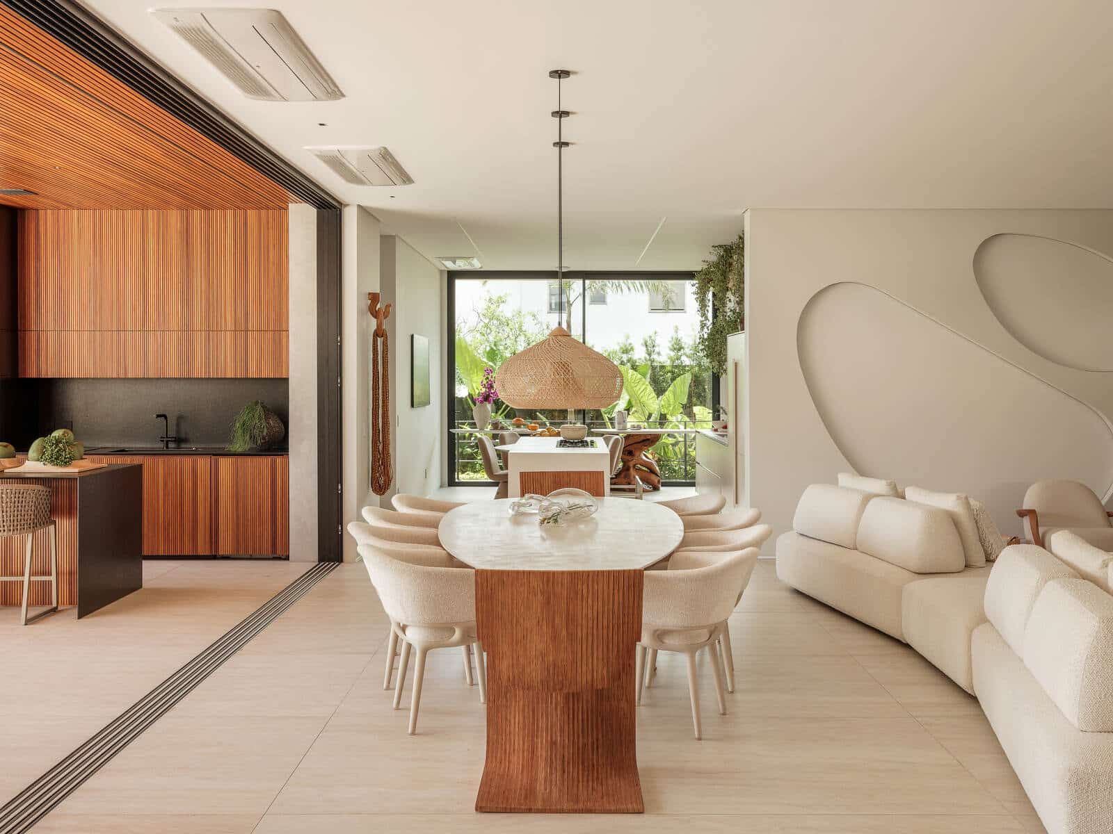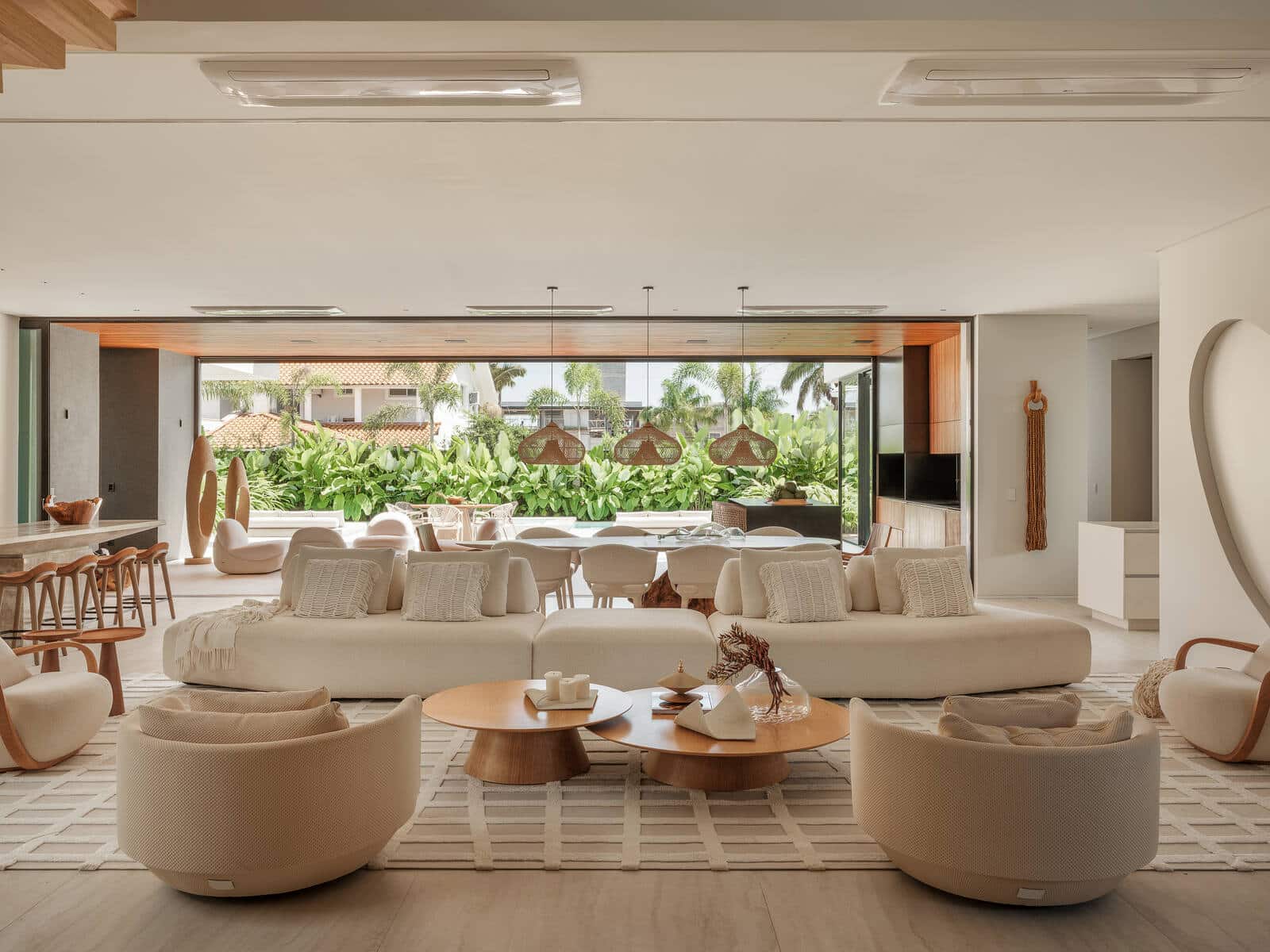 No coração do living, um sofá minimalista e poltronas arredondadas criam uma zona de acolhimento e repouso, onde a suavidade das formas convida ao relaxamento. A escada flutuante em madeira, com seus degraus suspensos, torna-se uma peça escultural que liga os níveis do ambiente, simbolizando a leveza e a continuidade.
