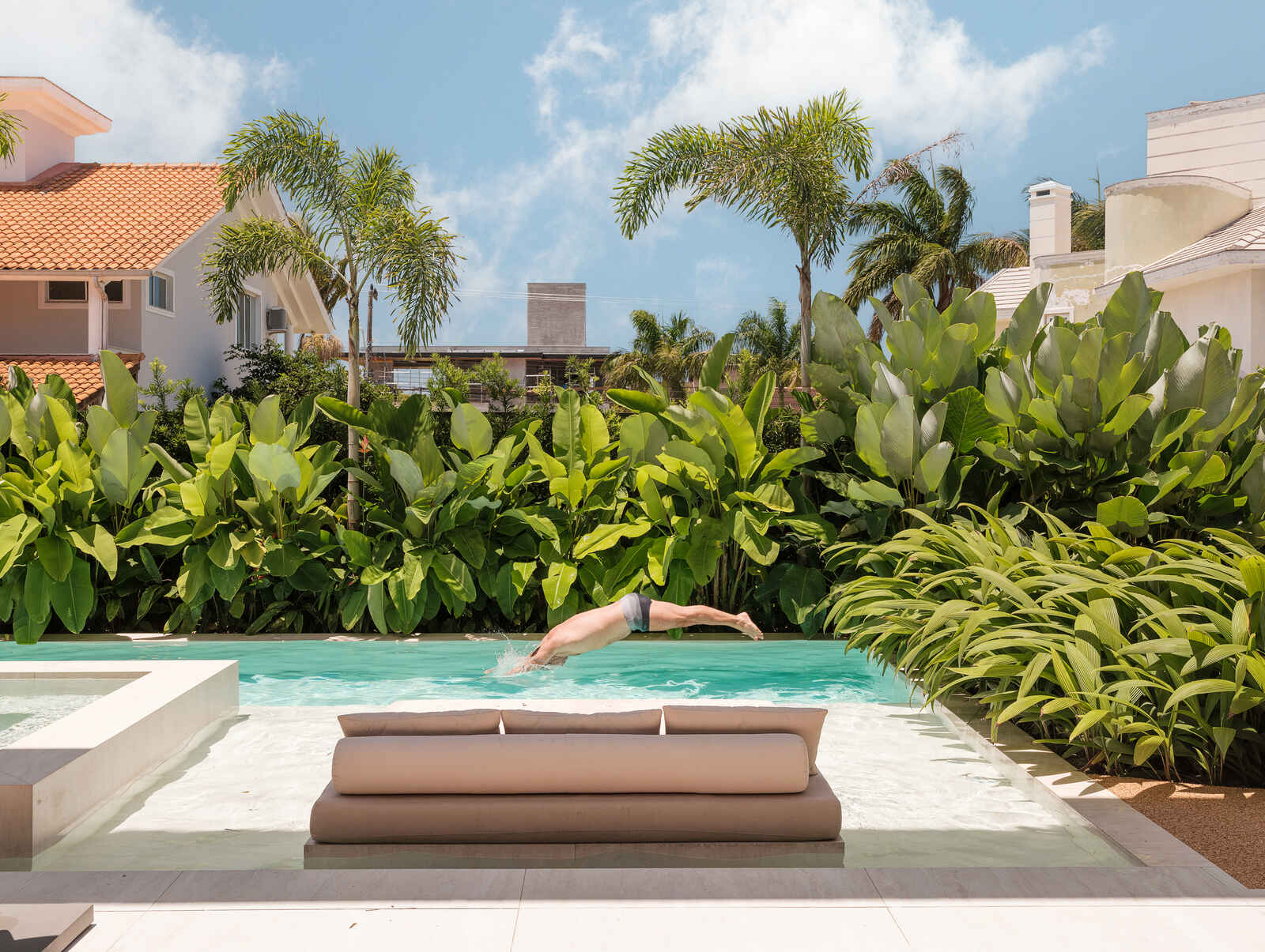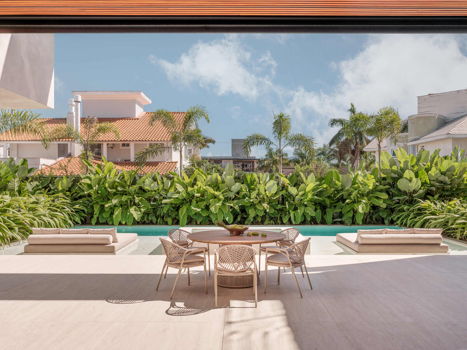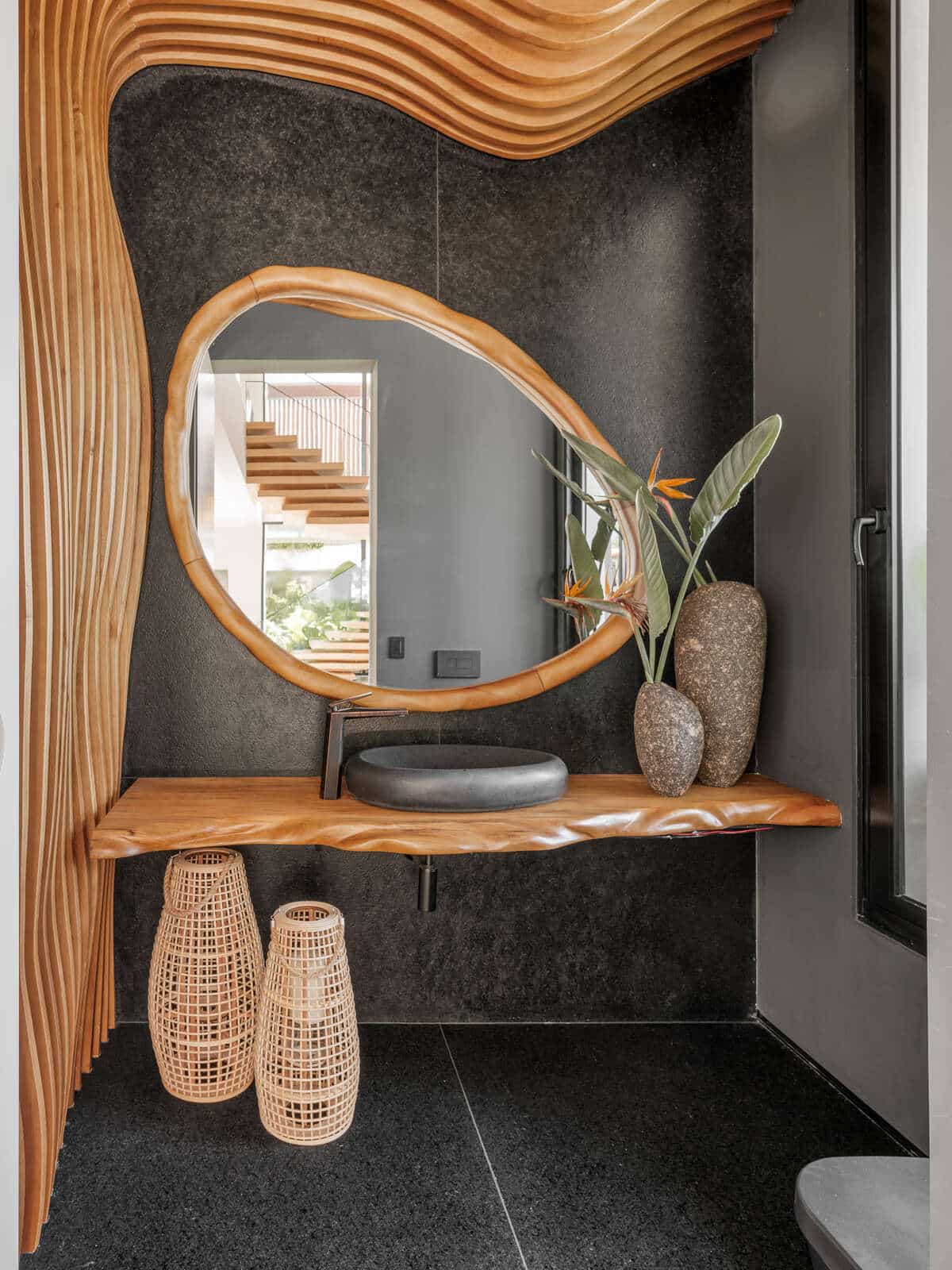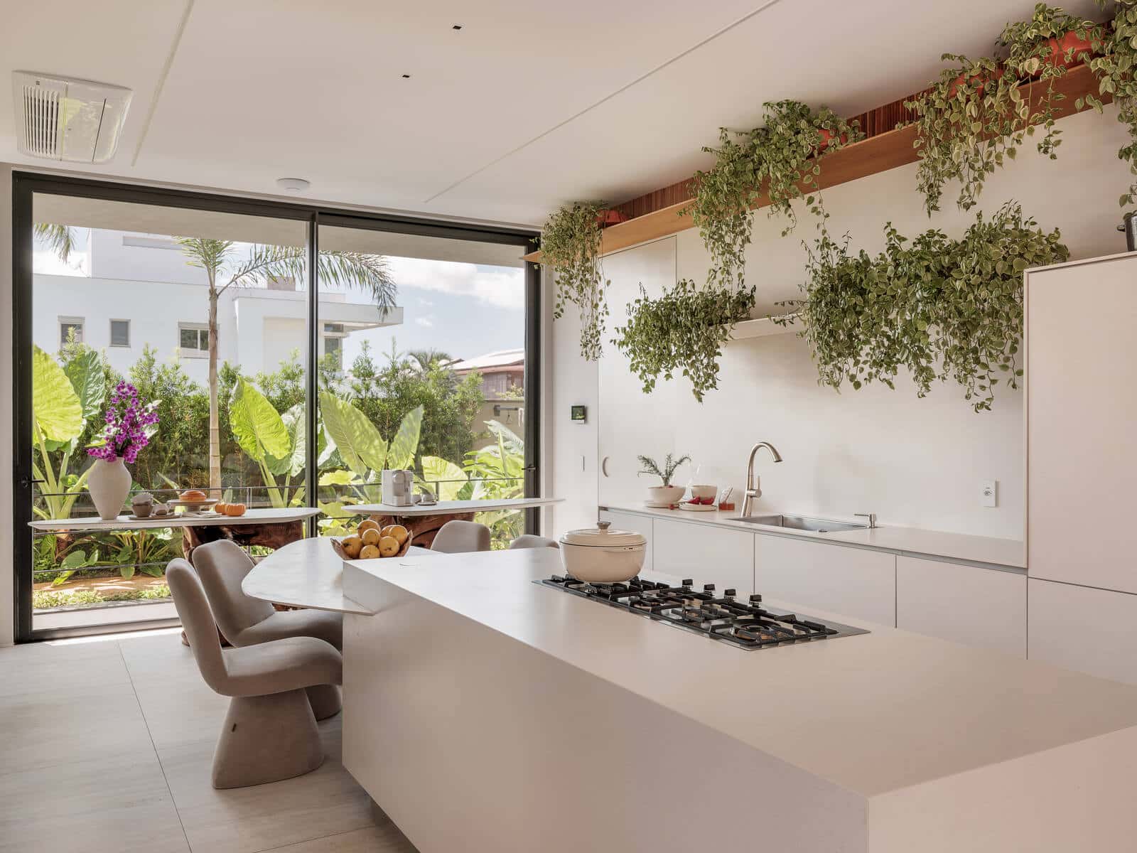 A presença de plantas naturais no interior não só traz vitalidade, mas também reforça a conexão com o ambiente natural.